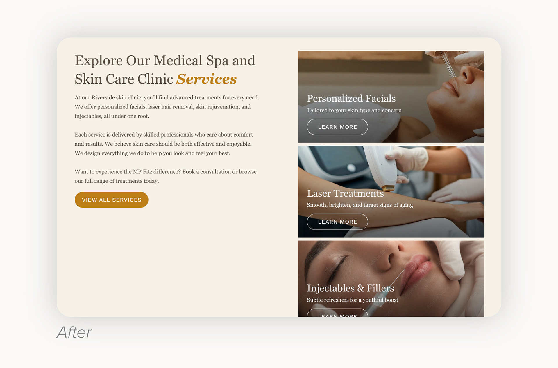 The homepage had a lot of disorganized content that was thrown on the page in random headers and paragraphs. My goal was to clean it up and make the med spa look as experienced, modern, and professional as they actually were.
