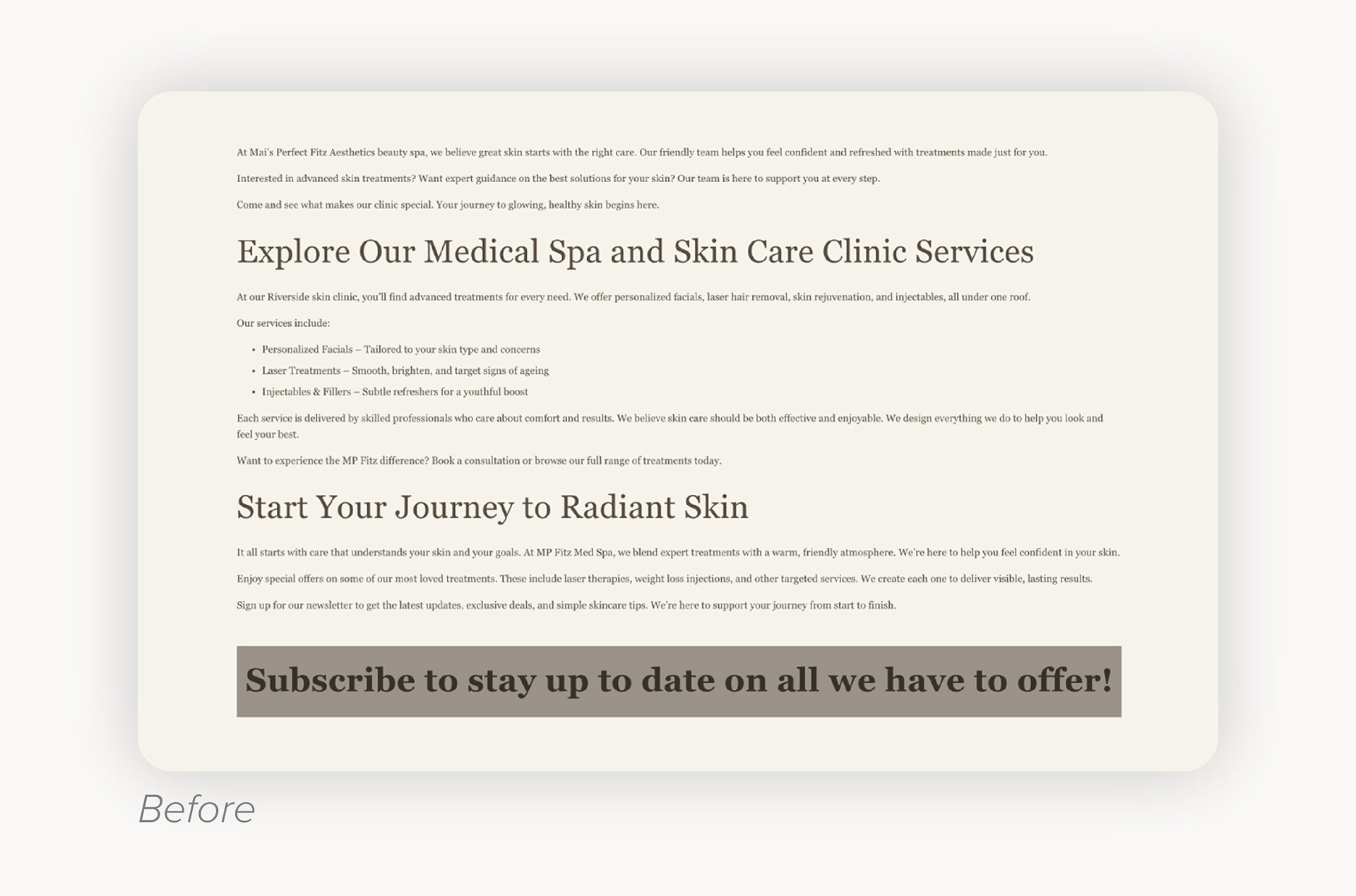 This was the bulk of the content on the page. It was just added here with no consideration for visuals, let alone user experience. The lines of text were too long, the services listed didn't link anywhere, and even the email subscription header was confusing - it looks like a giant button.