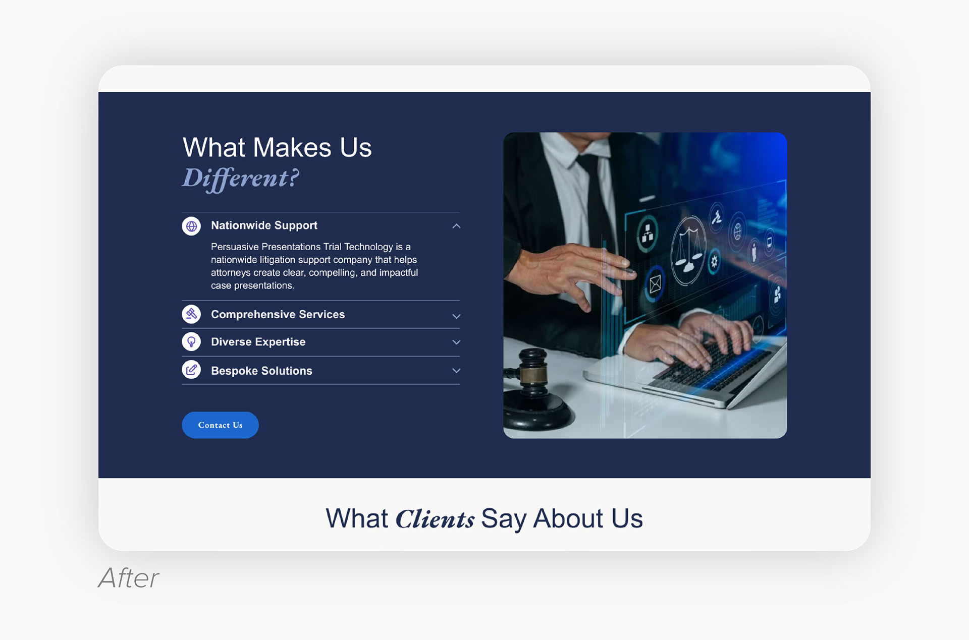 The hierarchy of the hero section was confusing, so I simplified it with a large banner image (one that more effectively communicates their offerings) and added some contextual copy, as well as their 95% success rate and a few buttons to immediately begin directing users through the conversion funnel. I reorganized the content of the page, placing the services above the recent settlements and verdicts data. I used an interactive layout for the services to encourage user engagement.