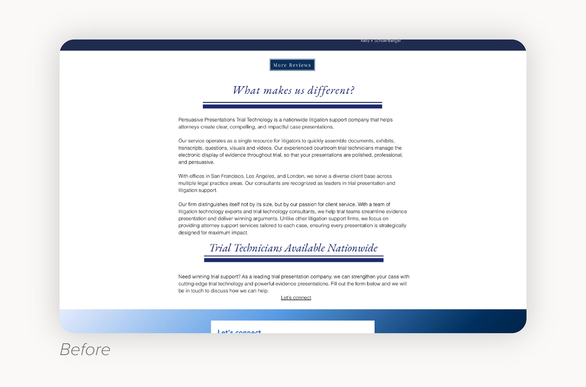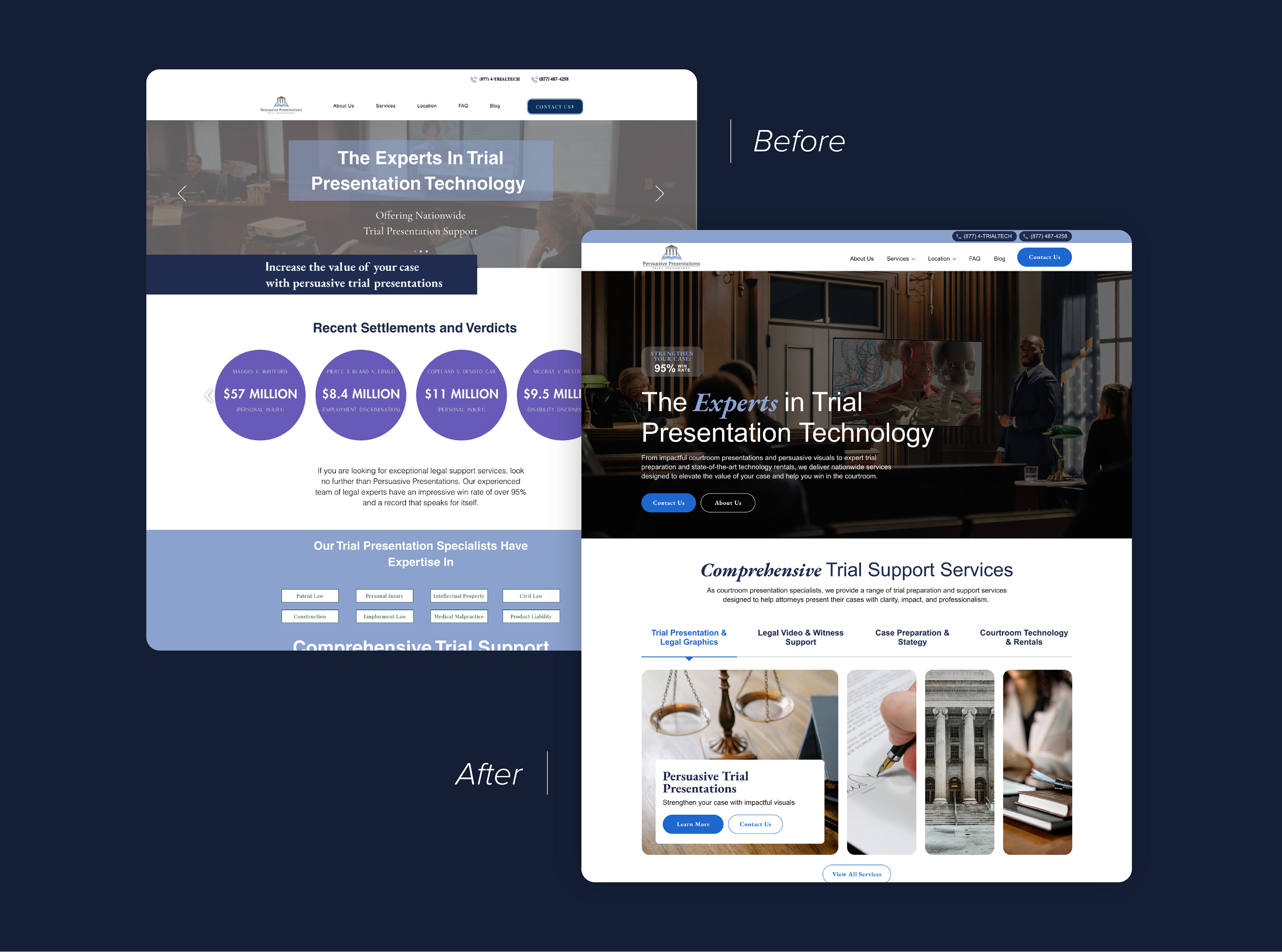 Persuasive Presentations Trial Technology supports legal professionals by creating high-quality visuals like graphics, charts, and videos to complement their case presentations. Their team of legal experts boast a 95% win rate - but their website was doing them no favors in communicating this.