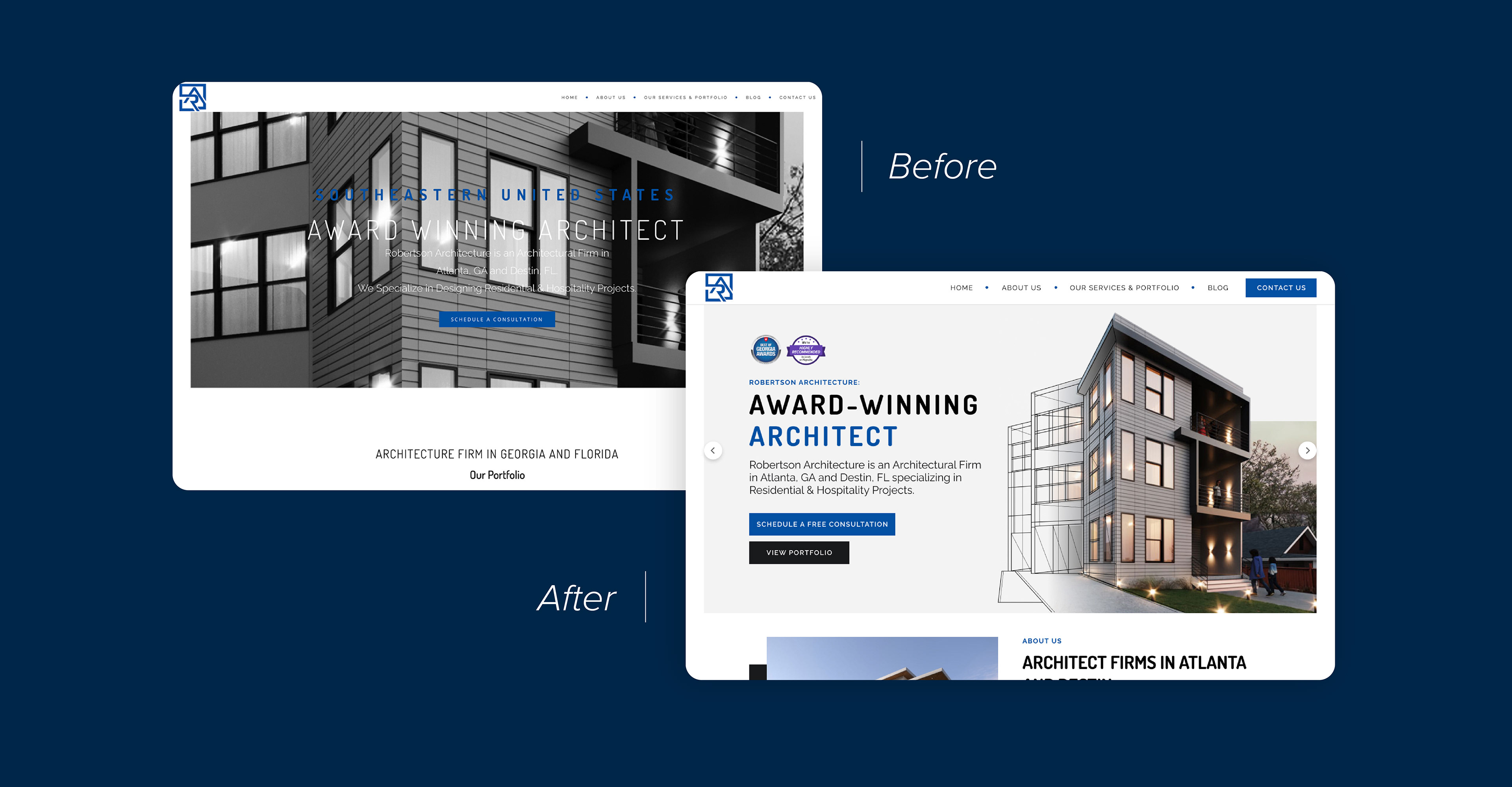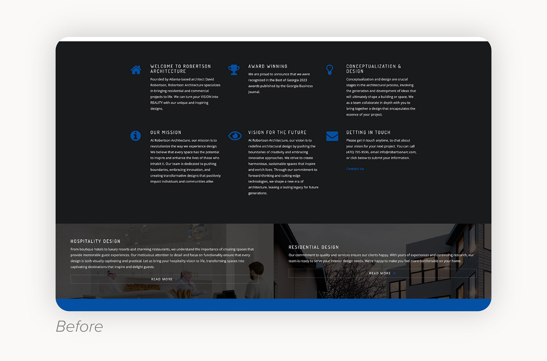 Robertson Architecture is a full-service hospitality and residential architectural firm based in Atlanta. During the course of our research, we determined that their site didn't effectively communicate their offerings. The firm was only recently established, so their portfolio isn't as comprehensive as competitors. With these challenges in mind, we moved forward with a redesign of some of their highest-impact pages including the homepage.
